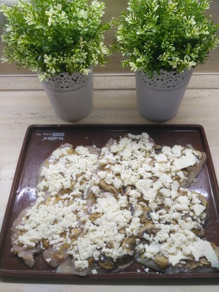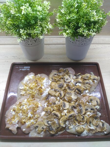 Поверх сыра равномерно выложите обжаренные грибы с луком. Если среди ваших близких есть те, кто не ест грибы, можно оставить несколько кусочков курицы без этой начинки — как сделала я.