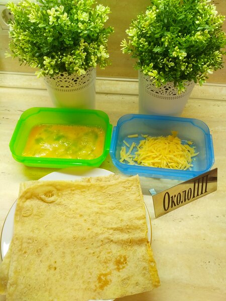 1. Подготовка ингредиентов: лаваш нарезаем на два квадрата. Яйца взбиваем в миске с добавлением соли и перца. Сыр натираем на крупной терке. Зелень мелко рубим.