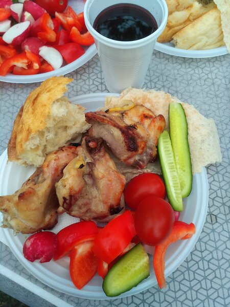 Практически весь день мы провели на свежем воздухе, общаясь и готовя шашлыки. Что может быть лучше хорошей компании и природы? На этот раз я ела шашлык из куриного бедра, много-много овощей и позволила себе те самые «грехи» — красное вино и лаваш.