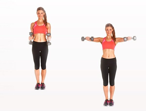 Это упражнение целенаправленно укрепляет дельтовидные мышцы плеч. В качестве утяжелителей используйте гантели, бутылки с водой или даже толстые книги.Встаньте прямо, ноги на ширине плеч, в руках — утяжелители. На выдохе плавно поднимите прямые руки перед собой до уровня плеч. Затем разведите их в стороны, образуя букву «Т». Задержитесь на 2-3 секунды в верхней точке и на вдохе медленно опустите руки. Контролируйте движение, не допускайте рывков.