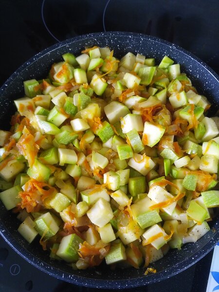 Когда лук с морковью станут мягкими, добавьте в сковороду нарезанные кабачки. Приправьте солью и перцем по вкусу. Тушите под крышкой на среднем огне до полной готовности кабачков — они должны стать мягкими, но не развариться.