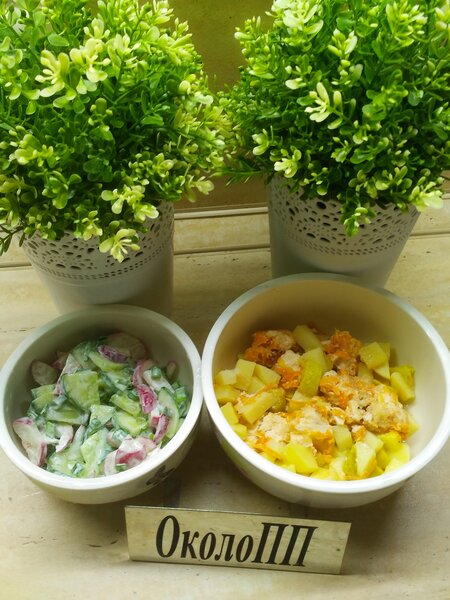 Горшочек - около 350 г и салат с огурцом (100 г) и редисом (60 г), заправленный 25 г 10% сметаны.
