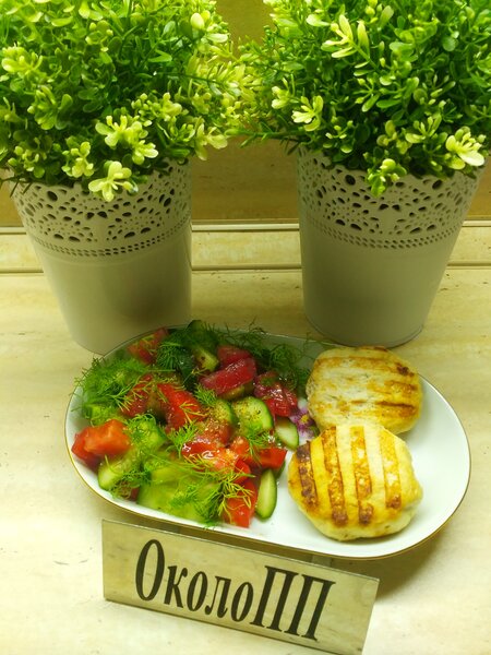 Ну а на ужин как и вчера куриные котлеты с творогом (около 150 г) и овощной салат: огурец (100 г), помидор (120 г), заправленный каплей оливкового масла.