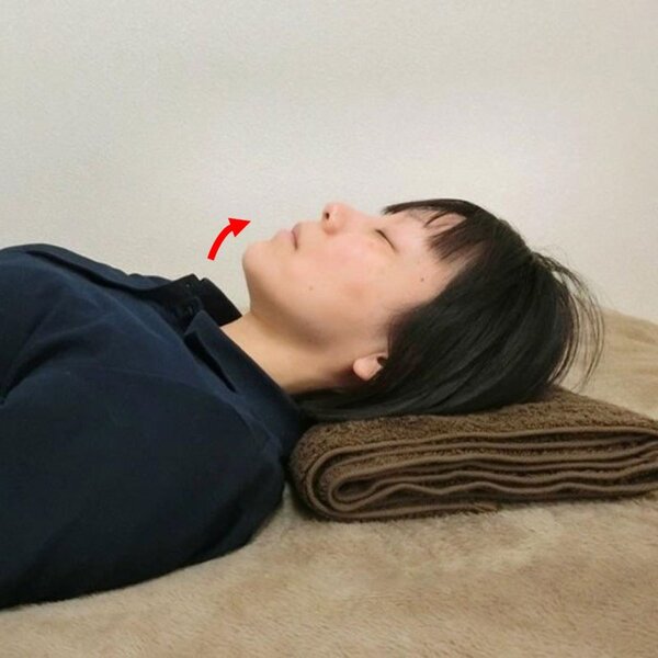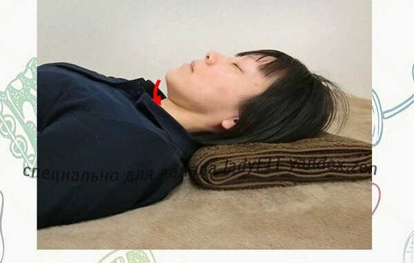 Лягте на спину, подложив невысокую подушку. Закройте глаза. Медленно поднимите подбородок вверх, а затем так же медленно опустите его в исходное положение. Повторите это движение 15 раз в спокойном, размеренном темпе.