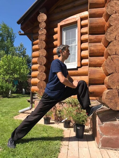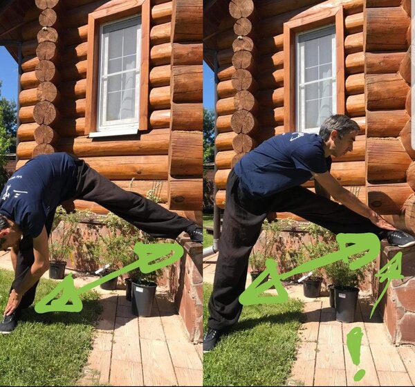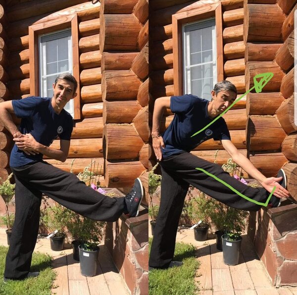 3. Работа с согнутой ногой. Теперь согните ногу, стоящую на возвышении, и вытяните опорную ногу и поясницу. Здесь важно действовать аккуратно и следовать принципу: сначала полное расслабление, затем плавное растяжение. Это защитит мышцы от травм. После упражнения встряхните ногами, чтобы сбросить остаточное напряжение. Такая практика, согласно философии Цигун, открывает энергетические каналы (меридианы) для свободного течения Ци — жизненной силы, что дарит прилив энергии и лёгкости.