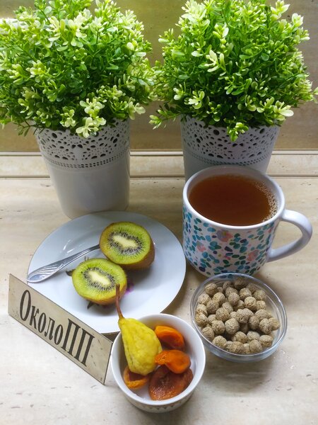 В него вошли сочный киви (120 г) и зеленый чай с порцией сухофруктов (50 г). Сухофрукты и 20 г ржаных отрубей я растянула на весь день, добавляя их к чаю.