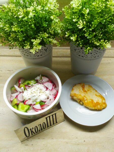 Вечерний прием пищи был легким: свежий салат из огурца (150 г) и редиса (60 г), заправленный 20 г 10%-ной сметаны. К нему я добавила 80 г куриной грудки, обжаренной без масла на антипригарной сковороде.