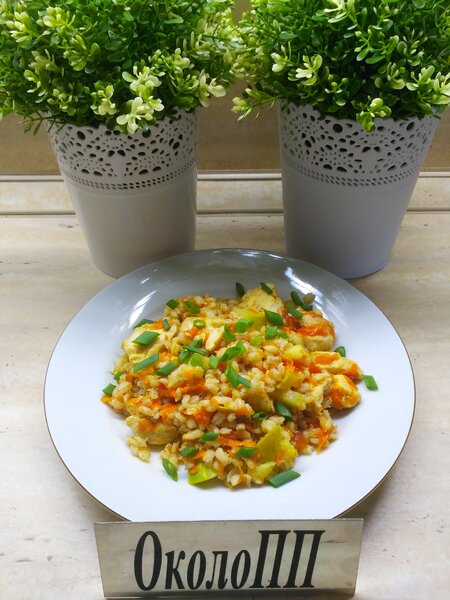 На обед я приготовила сытное и полезное блюдо — перловку с тушеными овощами и куриной грудкой. Порция каши с добавками составила 400 г.
