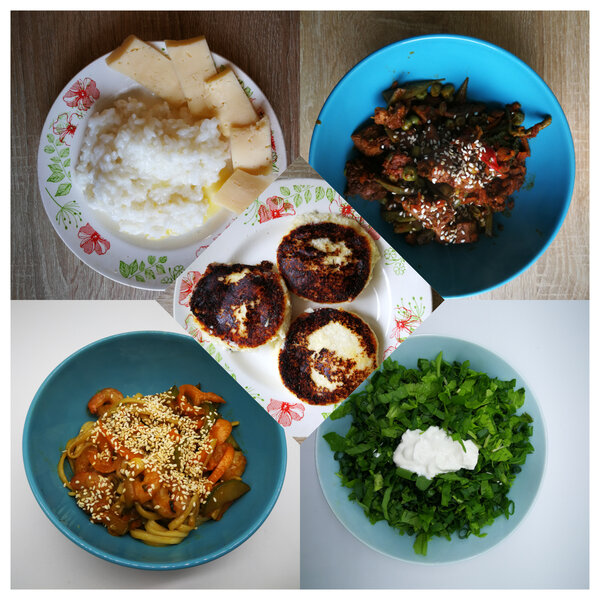 День пятый. Завтрак: рисовая каша с небольшим количеством масла и сыром. Обед: говядина с овощами. Ужин: лапша с креветками и овощами в соусе терияки. Перекусы: немного подгоревшие, но все равно вкусные сырники и легкий салат.