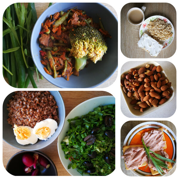 День третий. Завтрак: геркулесовая каша, хлебец с творожным сыром, кофе. Обед: говядина, тушенная с овощами, и свежая зелень. Ужин: гречка с вареными яйцами, овощами и зеленью. Перекусы: галеты с паштетом и небольшая порция орехов.