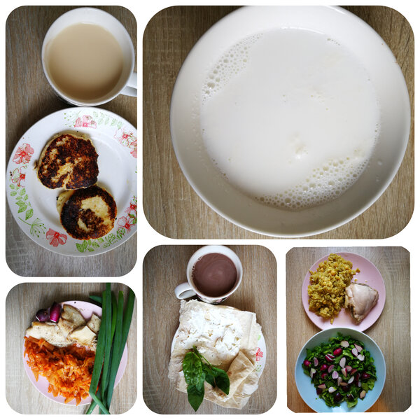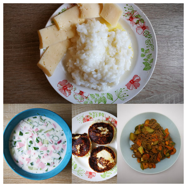 За неделю я приготовила не так уж много блюд. На завтрак я сварила большую порцию овсяной и рисовой каши. На основные приемы пищи: гречку, яйца, тушеные овощи с говядиной и свининой. Из более интересного — окрошку, омлет, лапшу с креветками. Единственный «сложный» перекус — это те самые сырники. Также в меню были тушеная капуста с рыбой, гороховая каша с курицей и молочный суп — эти блюда перекочевали и на следующую неделю.