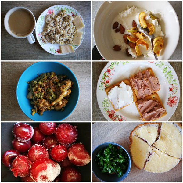 День четвертый. Завтрак: снова геркулесовая каша с сыром и кофе. Обед: остатки свинины с овощами. Ужин: большой омлет с зеленью. В этот день перекусы были более объемными: замороженная вишня, творог с ряженкой, орехами и сухофруктами, галеты с паштетом и творожным сыром.