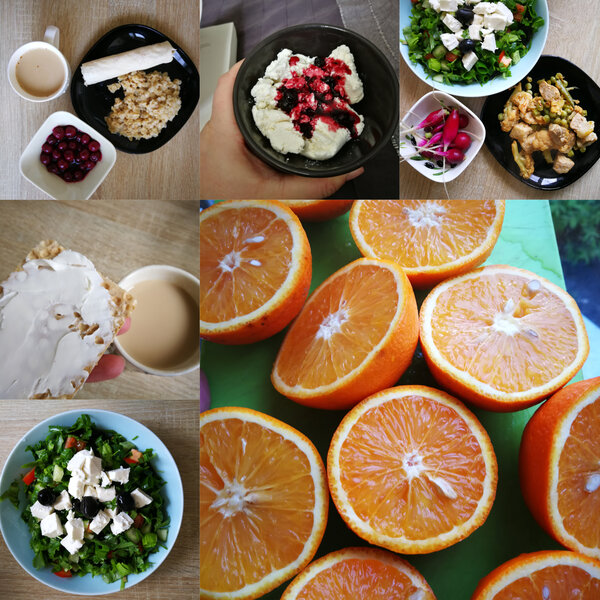 День второй. Завтрак: овсянка, лаваш с творожным сыром, замороженная вишня, кофе с молоком. Обед: тушеные овощи со свининой и салат из зелени с брынзой и оливками. Ужин: легкий салат с брынзой. Перекусы: творог с вареньем из смородины, кофе с хлебцем и творожным сыром, апельсиновый сок.