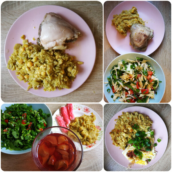 Вышло так, что основу рациона составили горох с курицей, тушёная капуста и суп с перловкой (его я не демонстрирую, так как он совершенно не фотогеничен). Готовить что-то новое я просто не успевала, потому что доедала приготовленные ранее блюда в различных комбинациях.