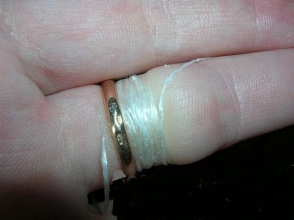 После того как палец замотан до самого кольца, нужно потянуть за тот самый кончик нити, который был изначально продет под украшение. Витки начнут последовательно разматываться, проталкивая кольцо по пальцу вверх, будто по резьбе.
