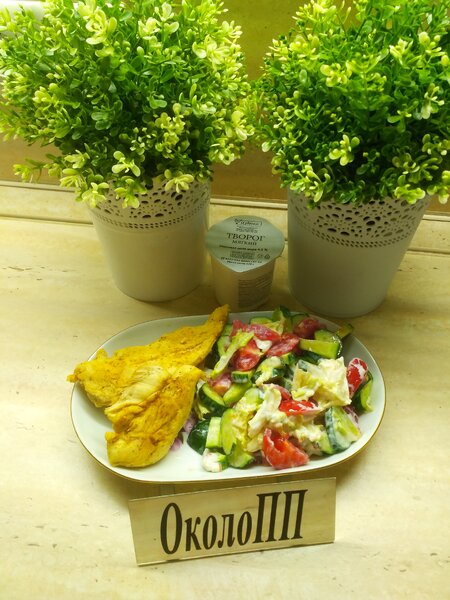 Ужин (320 ккал): На ужин у меня был легкий салат из помидора (120 г), огурца (110 г) и пекинской капусты (30 г), заправленный 40 г мягкого творога. К нему — куриная грудка (150 г), обжаренная на антипригарной сковороде без масла.