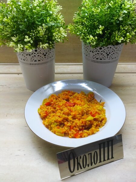 Обед (390 ккал): Быстро приготовила на сковороде булгур с овощами — получилось очень вкусно! Порция в 350 г — это 280 ккал. Плюс к этому (правда, не попала на фото) я съела 20 г горького шоколада (75%) с чаем во время работы — еще 110 ккал.