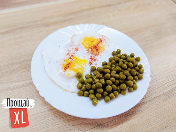 Блюдо: Зелёный консервированный горошек (100 г) + яичница из 2 яиц (категория С1).