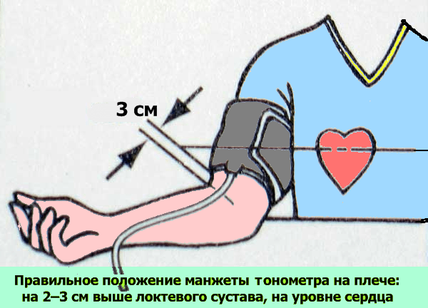 - Положение тела: Измерять давление нужно сидя, удобно опираясь на спинку стула. Рука с манжетой должна лежать на столе на уровне сердца. Сама манжета плечевого тонометра фиксируется на 2-3 см выше локтевого сгиба с таким расчётом, чтобы под неё можно было просунуть палец.