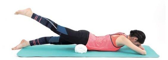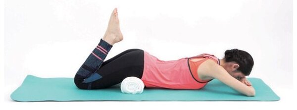 Лягте на пол, разместив валик чуть ниже уровня пупка. Руки положите под подбородок для удобства. Согните правое колено, максимально приблизив пятку к ягодице, и удерживайте это положение от 2 до 5 минут.