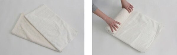 Сверните полотенца в плотный рулон, начиная с одного края. Старайтесь скручивать как можно туже, чтобы внутри не оставалось воздуха — это обеспечит валику необходимую жесткость и устойчивость.
