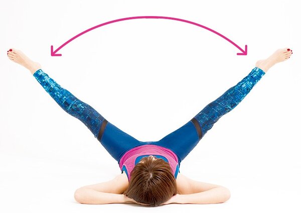 Из этого положения плавно разведите ноги в стороны на комфортную для вас ширину. Это движение задействует внутреннюю поверхность бедер. Ритм выполнения: одна секунда на разведение, одна секунда на сведение. Выполняйте движение в течение 1 минуты.