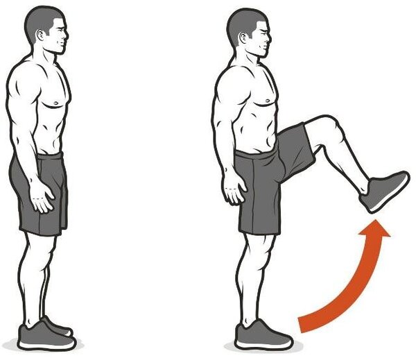 Выполнение: Маршируйте на месте, стараясь поднимать бедра как можно выше, до параллели с полом или чуть выше. Спину держите прямо.