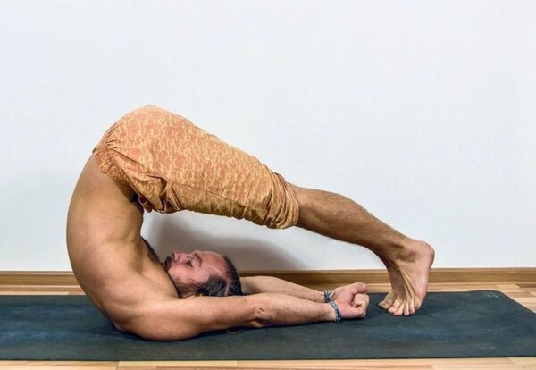 Эта асана способствует оттоку венозной крови из нижней части тела, снимает напряжение в спине и улучшает гибкость позвоночника. Лягте на спину, поднимите ноги и заведите их за голову, касаясь носками пола. Руки можно положить на поясницу для поддержки. Дышите спокойно и глубоко.