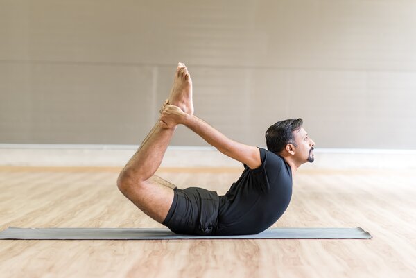 Поза лука укрепляет мышцы спины и живота, активизирует кровообращение в области таза и улучшает работу пищеварительной системы. Лягте на живот, согните ноги в коленях и захватите лодыжки руками. На вдохе поднимите грудь и бёдра, образуя «лук». Удерживайте положение несколько секунд, затем медленно опуститесь.