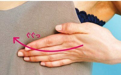 Расположите большой палец на передней поверхности груди. Аккуратно, но интенсивно захватите («ущипните») проблемную складку кожи и жировой ткани. Выполните около 10 таких щипков. Особое внимание и более интенсивное воздействие рекомендуется людям с повышенной жёсткостью и малоподвижностью в плечевом поясе.