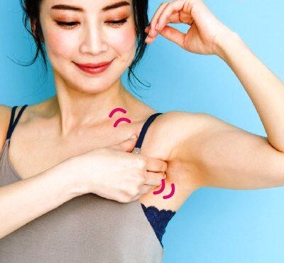 Поместите большой палец в область крупного лимфатического узла, известного в японской практике как «ваки» (расположен в подмышечной впадине). Остальными пальцами мягко захватите и слегка стяните кожу с подкожной клетчаткой, в то время как большой палец остаётся неподвижным на спине для опоры. Повторите это движение 10 раз, избегая болезненных ощущений.