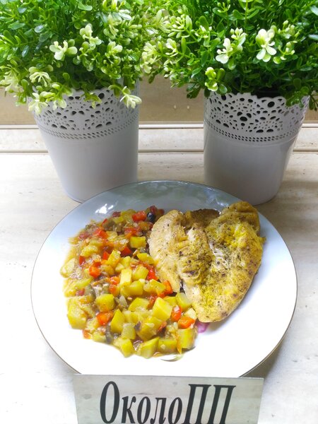 Ужин: На ужин я съела куриную грудку, запеченную в духовке (150 г), и порцию овощного рагу (200 г).