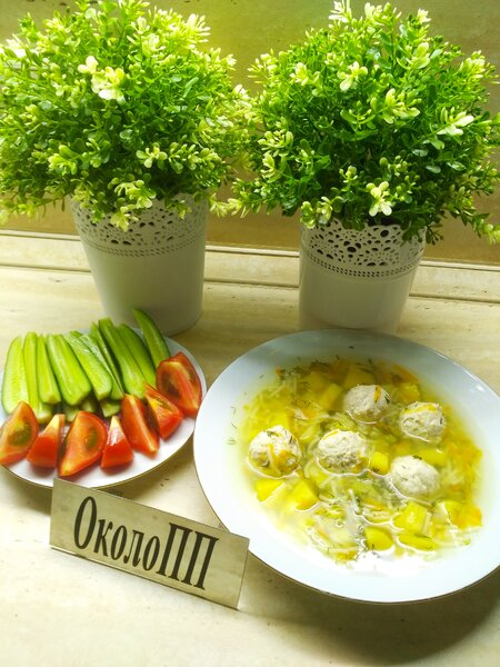 Обед: На обед у меня была тарелка сытного супа с куриными фрикадельками (450 г), который я приготовила накануне. К супу добавила порцию свежих овощей: огурец (100 г) и помидор (100 г).