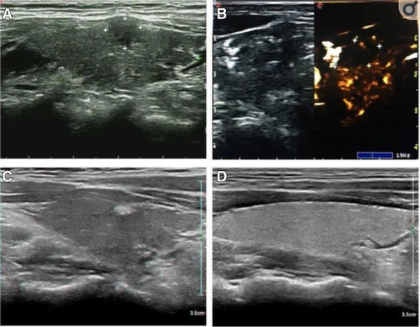 Рисунок из указанной статьи. А — исходный узел. В — снимок с контрастом. С — состояние через 6 месяцев после абляции. D — результат через 1,5 года: рубец отсутствует.