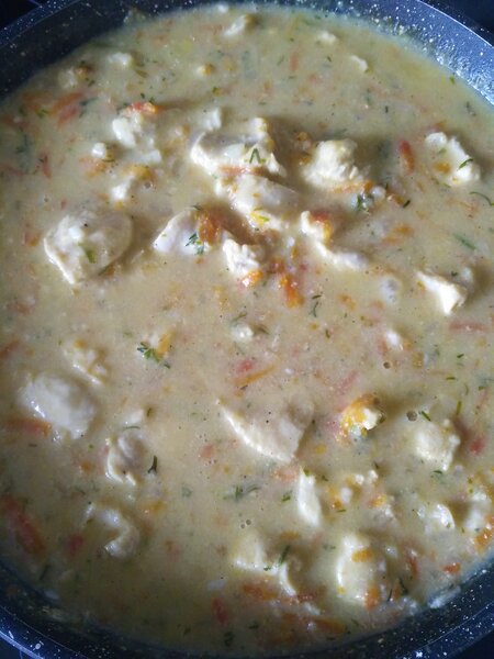 Пока основная часть тушится, приготовим нежную заправку. Натрите на терке сыр (например, «Сваля»). В сковороду к почти готовой курице добавьте натертый сыр, мягкий творог и цельнозерновую пшеничную муку. Тщательно перемешайте все ингредиенты до однородности.