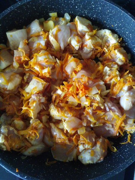 Пока лук с морковью подрумяниваются, нарежьте куриную грудку небольшими, удобными для еды кубиками. Добавьте курицу к овощам в сковороду. Посолите, поперчите по вкусу, добавьте щепотку сушеного чеснока для аромата и обжарьте все вместе в течение нескольких минут, чтобы мясо схватилось.