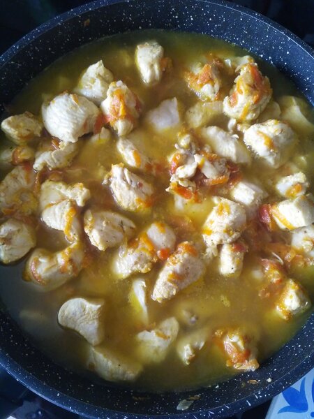 Теперь влейте в сковороду примерно 200 мл воды, накройте ее крышкой и тушите курицу с овощами на среднем огне около 15 минут. За это время мясо станет мягким и пропитается ароматами.