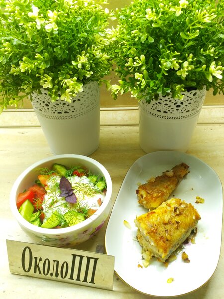 На ужин я приготовила минтая, обвалянного в цельнозерновой муке и обжаренного на минимальном количестве оливкового масла (200 г в сыром виде, кожу я не ела). К нему подался свежий овощной салат из помидоров и огурцов (около 200 г), заправленный мацони (30 г). Этот легкий и полезный ужин потянул на 290 ккал.