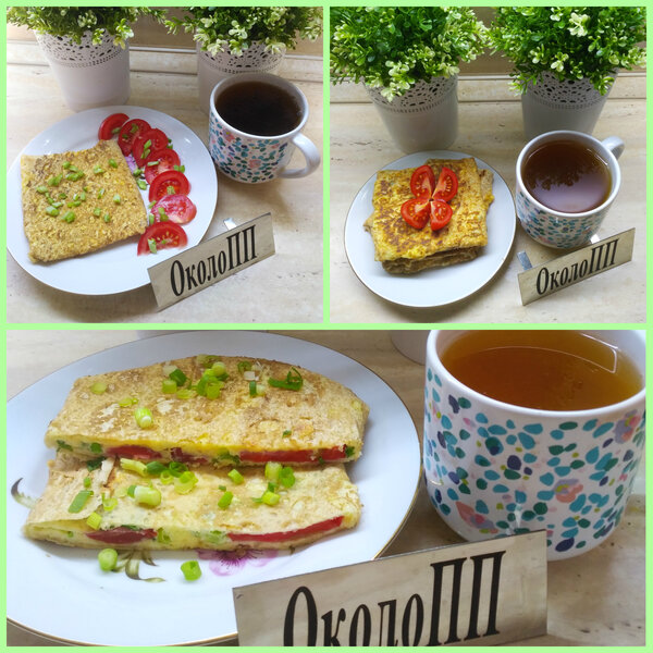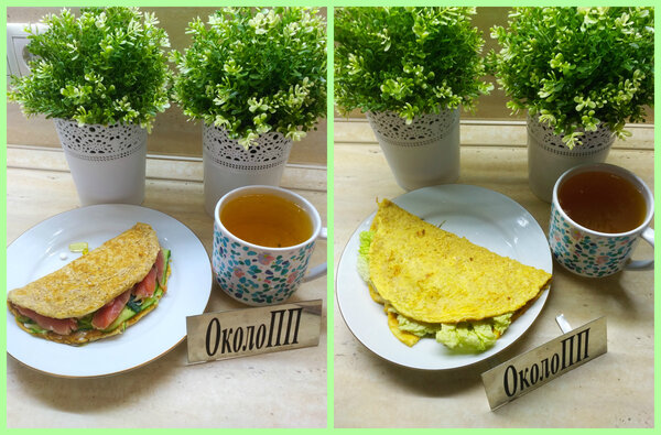 Второй вариант — сытная яичница, завёрнутая в лаваш. На порцию нужно: 50 г тонкого лаваша, 2 яйца, 30 г маложирного сыра, соль, зелень. По желанию добавьте помидор. Энергетическая ценность — около 415 ккал. Подробный рецепт смотрите по ссылке.