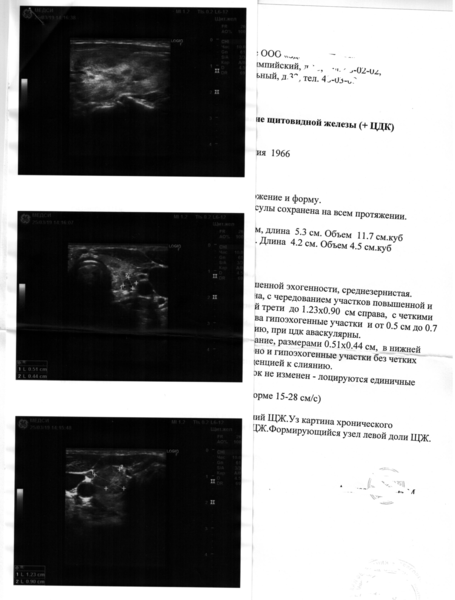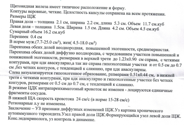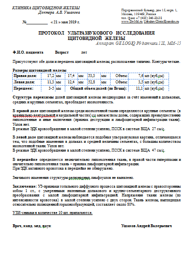 Заключение: Ультразвуковые признаки тотального диффузного процесса в щитовидной железе с увеличением правой доли (зоб 1-й степени), с умеренными явлениями разрушительных изменений в дольках и сегментах, сопровождающихся незначительной инфильтрацией лимфоцитами. Напряжённость ткани железы (по показателям кровотока) незначительно повышена с обеих сторон. Объём относительно полноценной гормонообразующей ткани составляет около 80–85%.