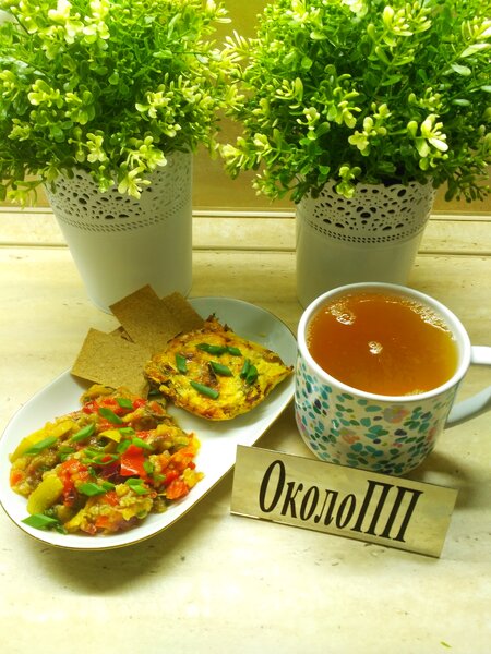 Вечерний прием пищи был легким: небольшой кусочек той же куриной запеканки (140 г) и порция запеченных овощей (180 г) в качестве гарнира. Добавила для хруста немного тонких хлебцев (10 г).