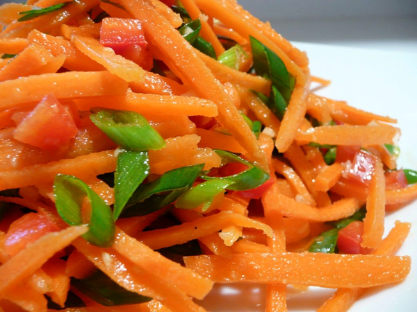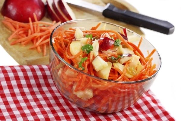 • Салат из двух крупных тертых морковок, заправленный лимонным соком и нежирной сметаной. Для сладости и пользы можно добавить немного сухофруктов (изюм, курага).
