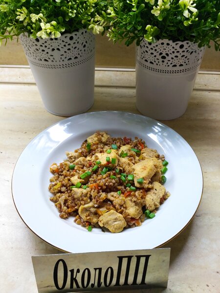 Расстроенная поломкой весов, я все же приготовила обед — гречку «по-купечески» с куриной грудкой, перцем и помидором. Пришлось примерно подсчитать КБЖУ: порция в 350 г получилась на 400 ккал.