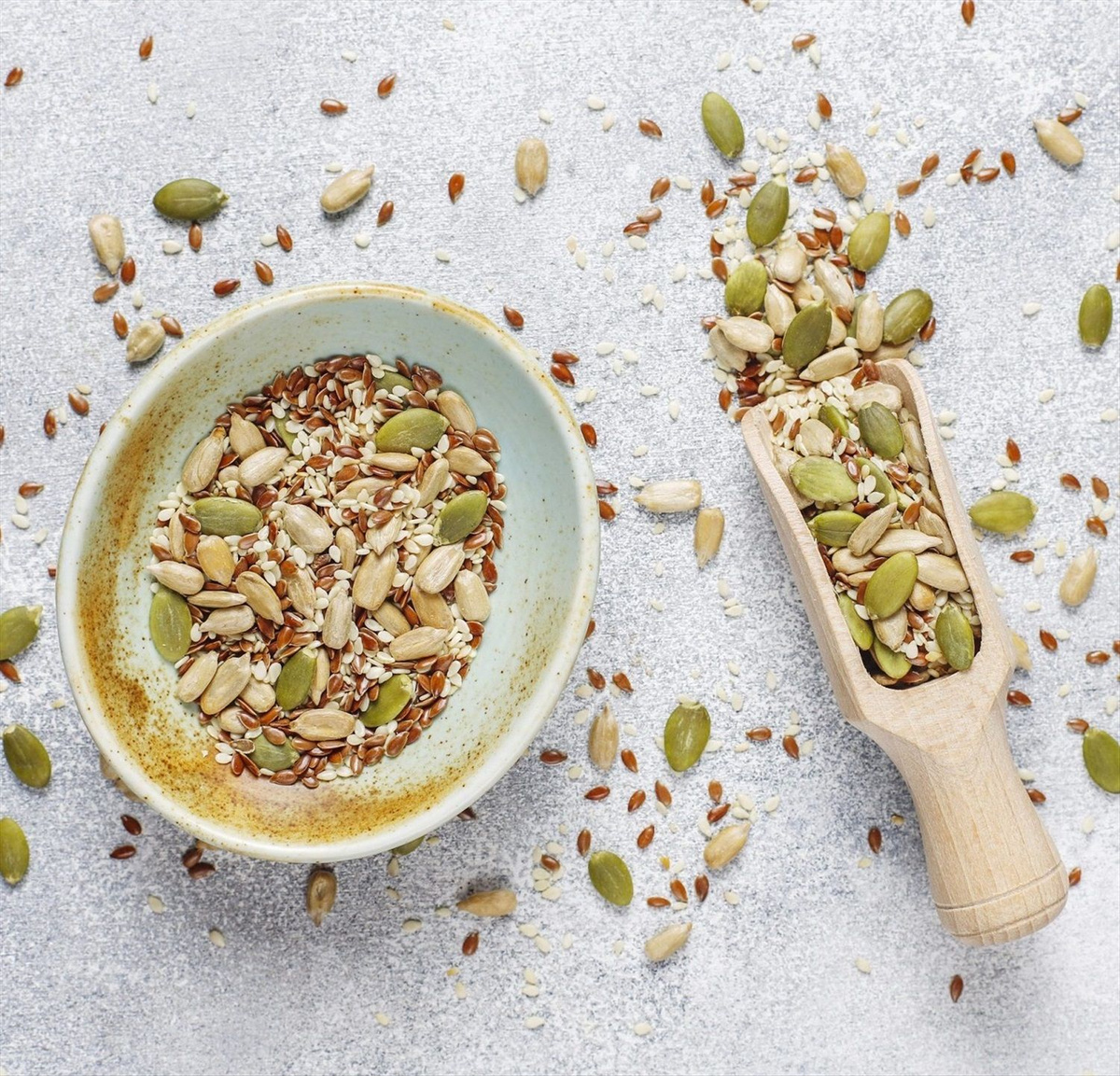 Тыквенные семечки, как и подсолнечные, являются богатым источником минералов, включая железо, фосфор, магний, калий и марганец. Особую ценность им придают фитостерины — жирные кислоты, структурно схожие с холестерином, но обладающие полезными свойствами. Они способны замещать «плохой» холестерин, тем самым снижая его уровень в организме. Также семена тыквы содержат много клетчатки и белка. Их калорийность — 446 ккал на 100 грамм. Добавление тыквенных семечек в простой салат из помидоров, огурцов и листовой зелени придаст ему новый вкус и питательную ценность.