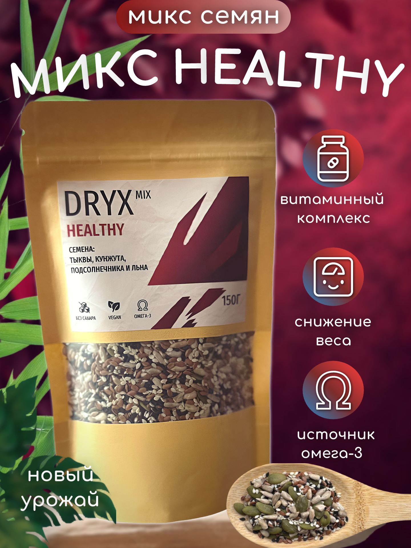 Семена подсолнечника — это превосходный источник полезных жиров, в основном полиненасыщенных и мононенасыщенных, которые составляют до 80% их состава. Они также богаты витамином Е — мощным антиоксидантом, защищающим клетки и их мембраны от повреждения свободными радикалами. Кроме того, в них содержится значительное количество белка (около 22%), а также важные микроэлементы: медь, селен, цинк, калий и витамин В1. Энергетическая ценность составляет 585 ккал на 100 грамм, что делает их питательным дополнением к любому блюду.